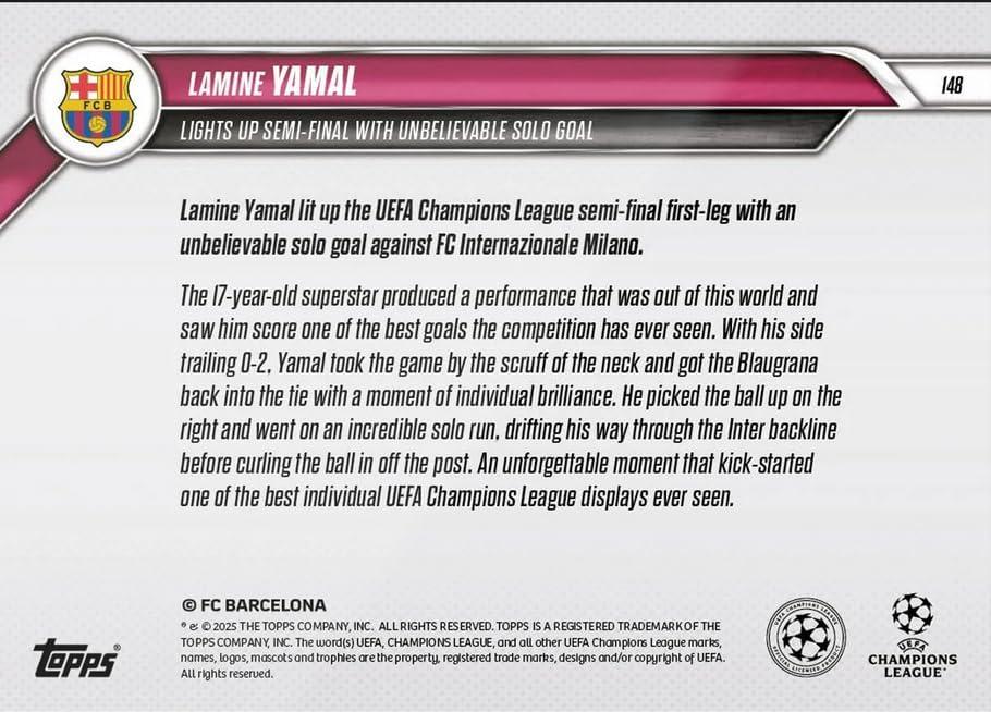 2024-25 Topps Now UCL Lamine Yamal #148 Lights Up Semi Final with Unbelievable Solo Goal FC Barcelona Soccer Card