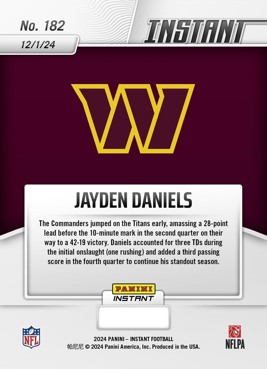 2024 Panini Instant NFL Jayden Daniels #182 Washington Commanders Rookie RC Football Card
