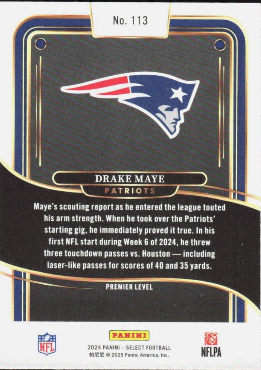 2024 Panini Select Drake Maye #113 New England Patriots Rookie RC Football Card
