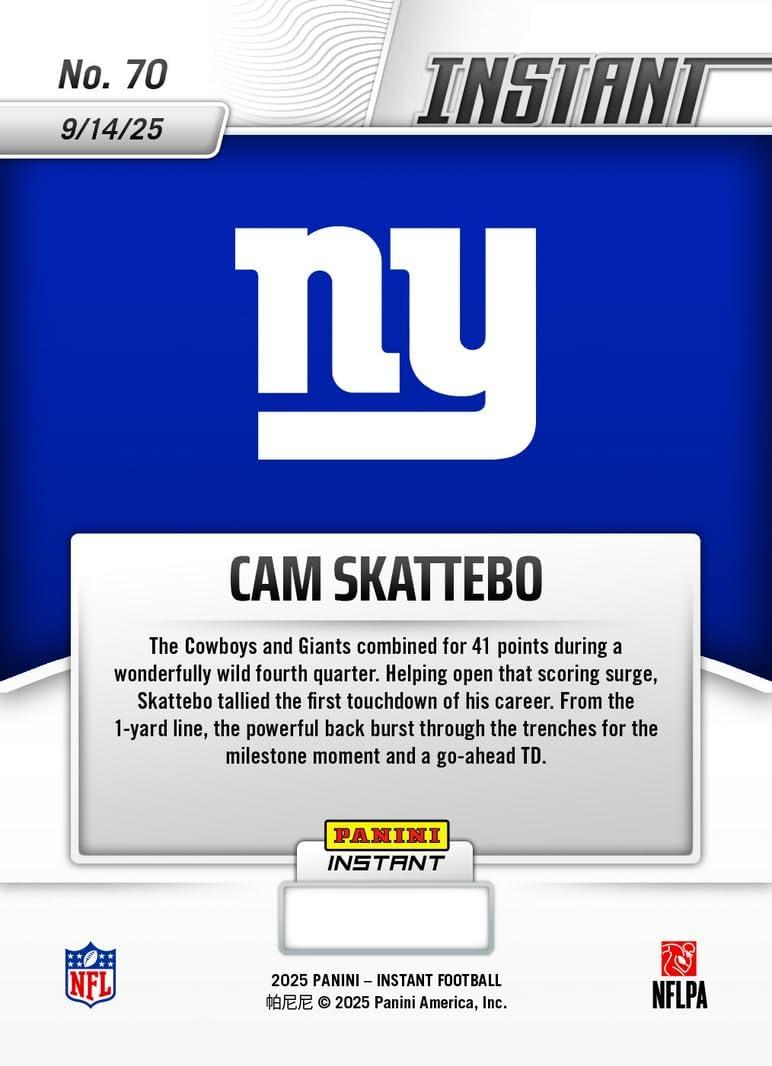 2025 Panini Instant Cam Skattebo #70 Skattebo Scats For First Career Strike New York Giants Rookie RC Football Card