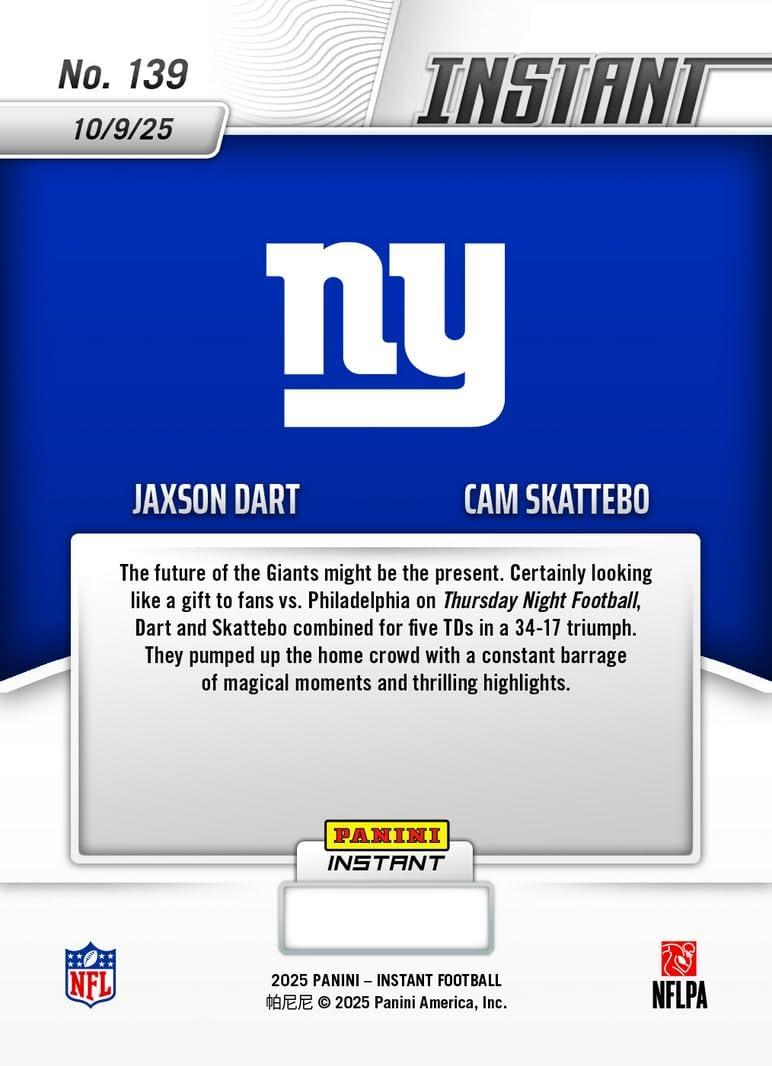 2025 Panini Instant NFL Jaxson Dart/Cam Skattebo #139 Rookie Duo Exudes Energy & Excitement New York Giants Rookie RC Football Card