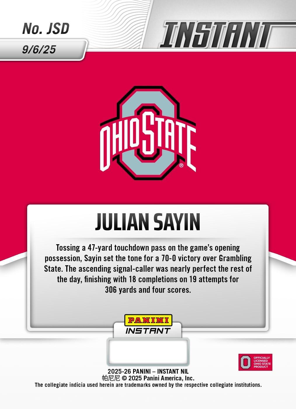 2025 Panini Instant NIL Julian Sayin #JSD Ohio State Buckeyes Rookie RC Football Card