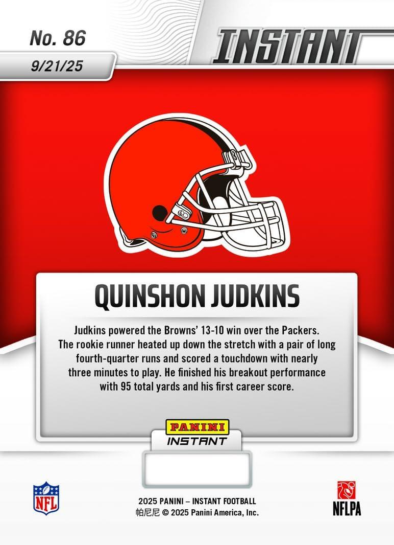 2025 Panini Instant Quinshon Judkins #86 Ruff Ruff: Rookie Riles Up Dawg Pound With TD Cleveland Browns Rookie RC Football Card