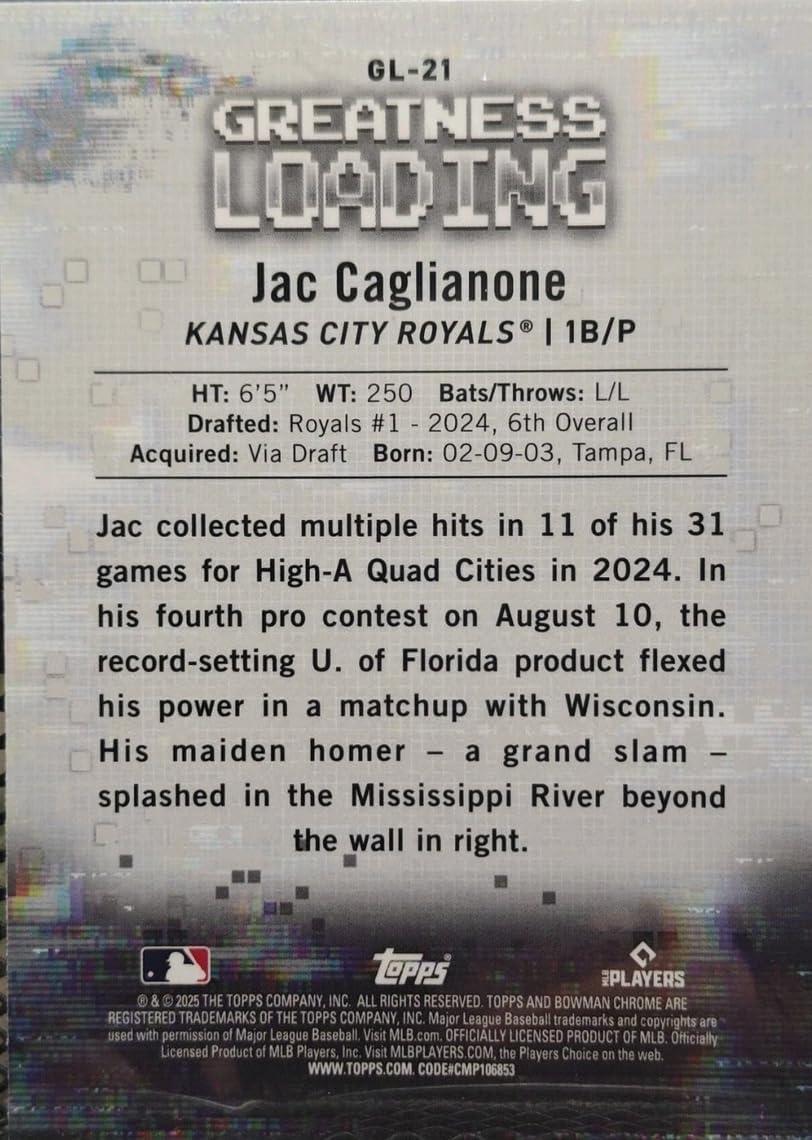 2025 Topps Bowman Jac Caglianone #GL21 Greatness Loading Kansas City Royals Rookie RC Baseball Card