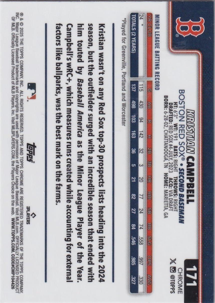 2025 Topps Chrome Kristian Campbell #171 Boston Red Sox Rookie RC Baseball Card
