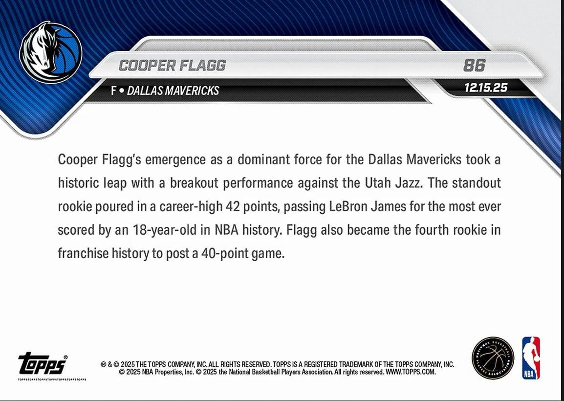 2025 Topps Now Cooper Flagg #86 Youngest Player in NBA History to Score 40+ Points Dallas Mavericks Rookie RC Basketball Card