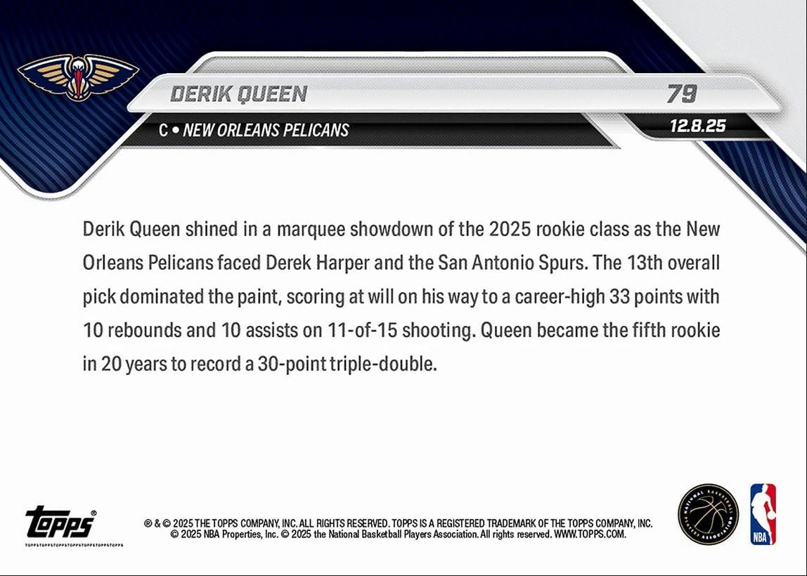 image2025 Topps Now Derik Queen 79 Star Rookie Logs First Career Triple Double New Orleans Pelicans Rookie RC Basketball Card