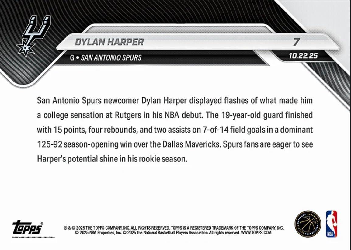 2025 Topps Now Dylan Harper #7 2025 Number 2 Pick Makes NBA Debut San Antonio Spurs Rookie RC Basketball Card