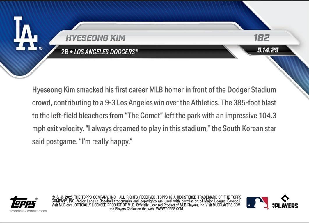 image2025 Topps Now Hyeseong Kim 182 South Korean Star Slugs 1st MLB Homer Los Angeles Dodgers Rookie RC Baseball Card