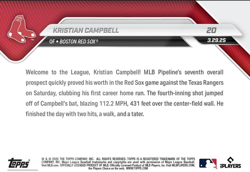 2025 Topps Now Kristian Campbell #20 Hits 1st Home Run Boston Red Sox Rookie RC Baseball Card