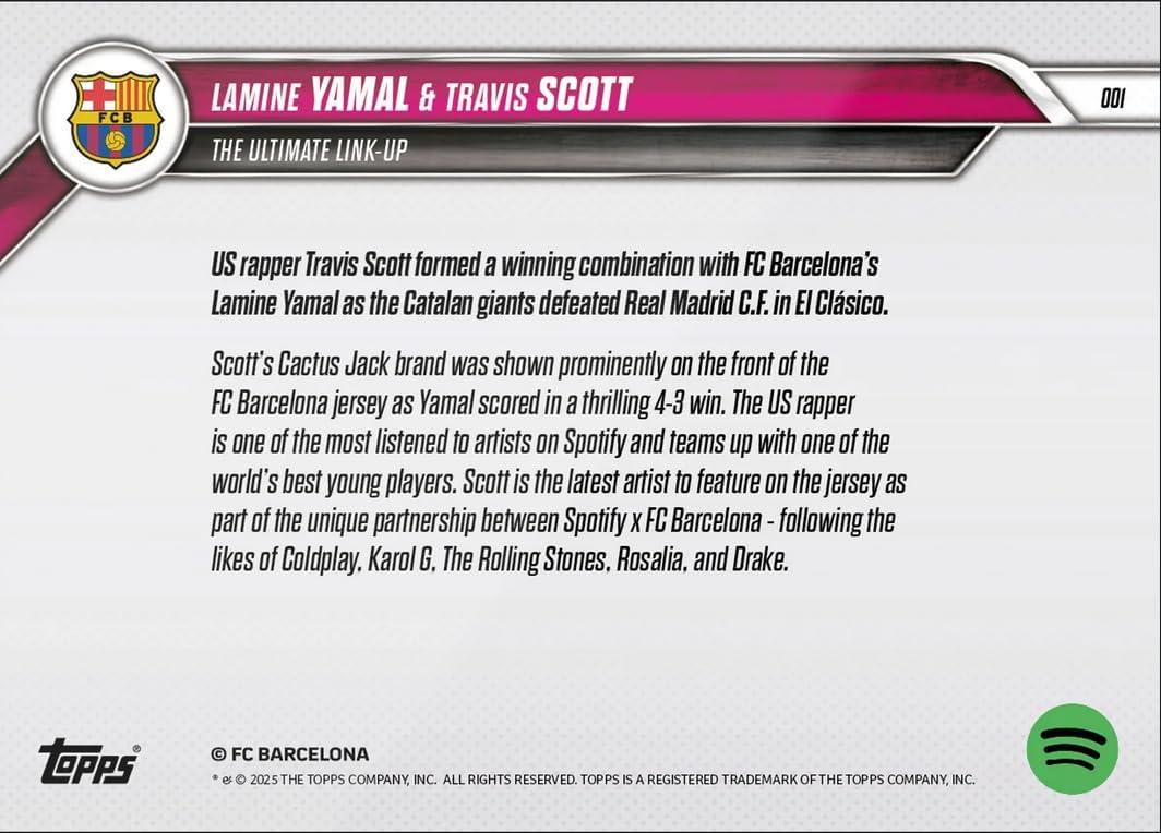 2025 Topps Now Lamine Yamal/Travis Scott #1 The Ultimate Link Up FC Barcelona Soccer Card