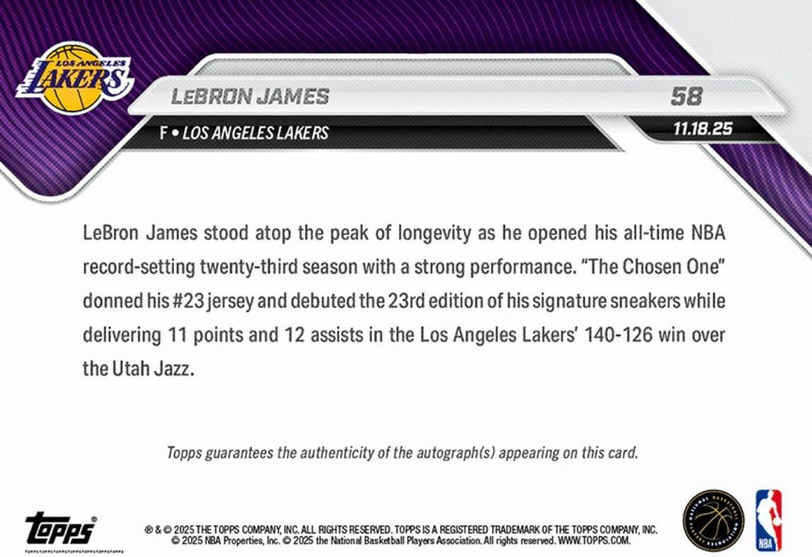 2025 Topps Now LeBron James #58 King James Sets NBA Record With 23rd Season Los Angeles Lakers Basketball Card