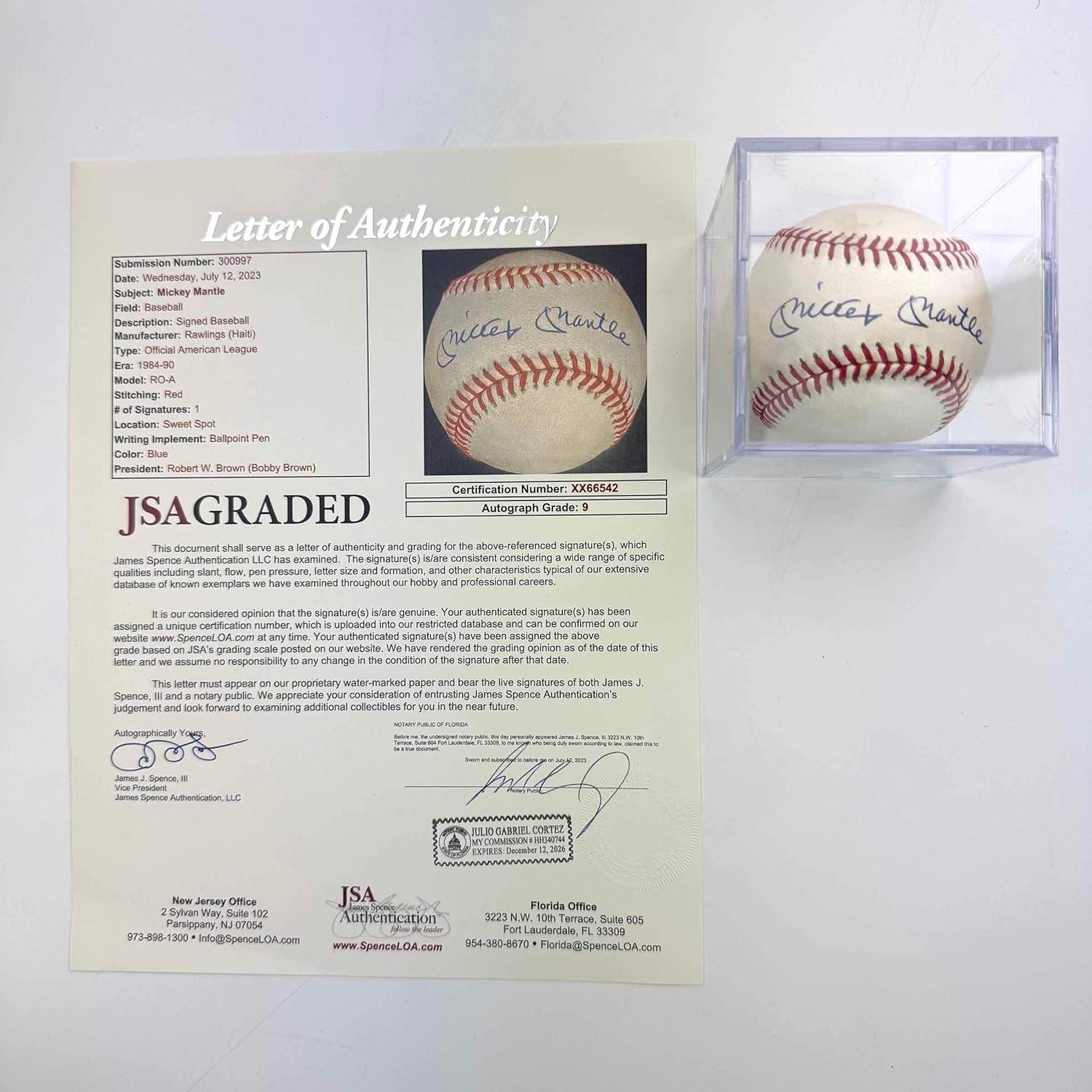 imageAutographedSigned Mickey Mantle Rawlings Official American League ROA Sweet Spot Baseball JSA 9 Graded LOA