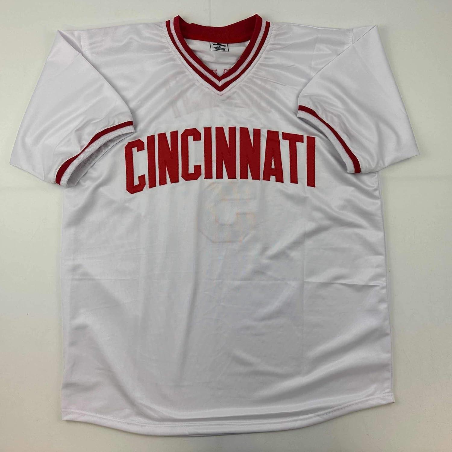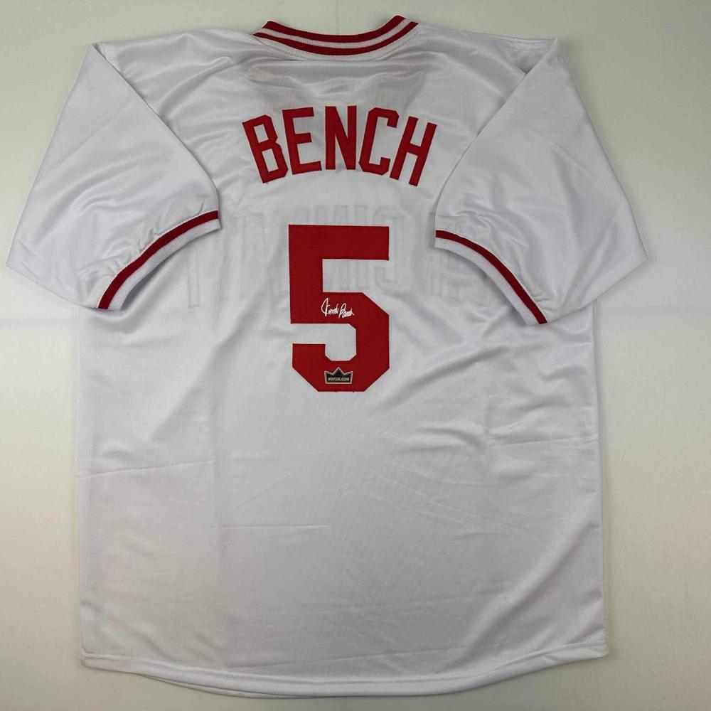 imageFacsimile Autographed Johnny Bench Cincinnati White Reprint Laser Auto Baseball Jersey Size Mens XL