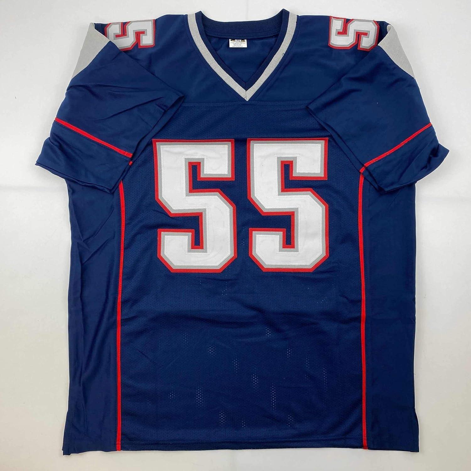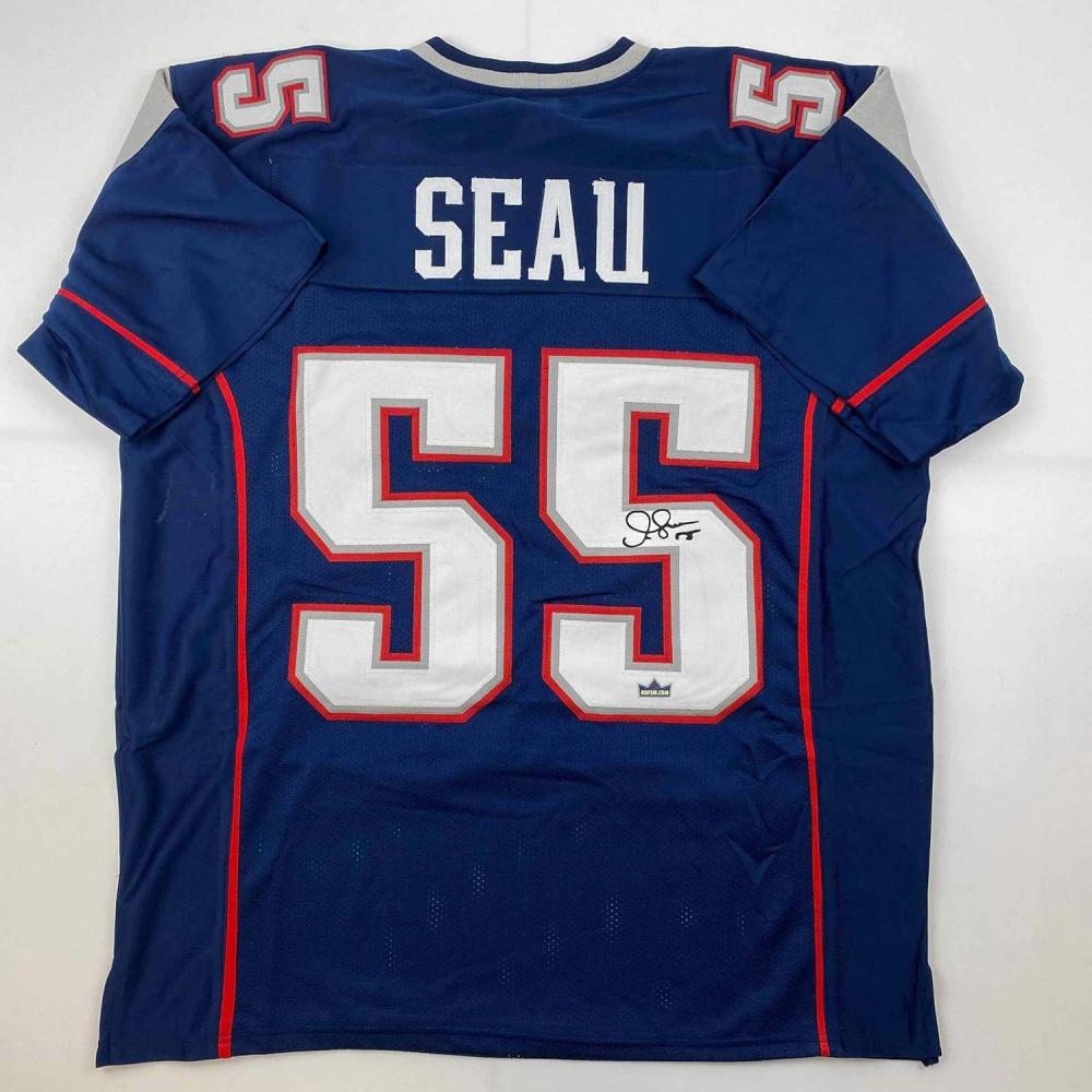 imageFacsimile Autographed Junior Seau New England Blue Reprint Laser Auto Football Jersey Size Mens XL