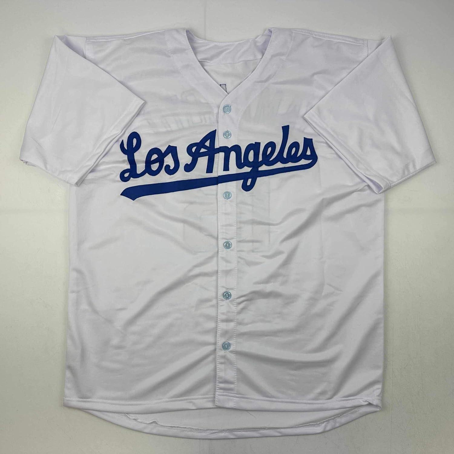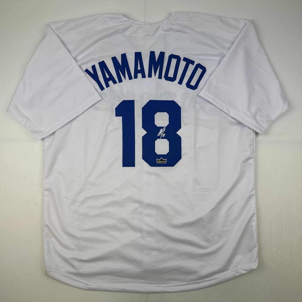 imageFacsimile Autographed Yoshinobu Yamamoto Los Angeles LA White Reprint Laser Auto Baseball Jersey Size Mens XL