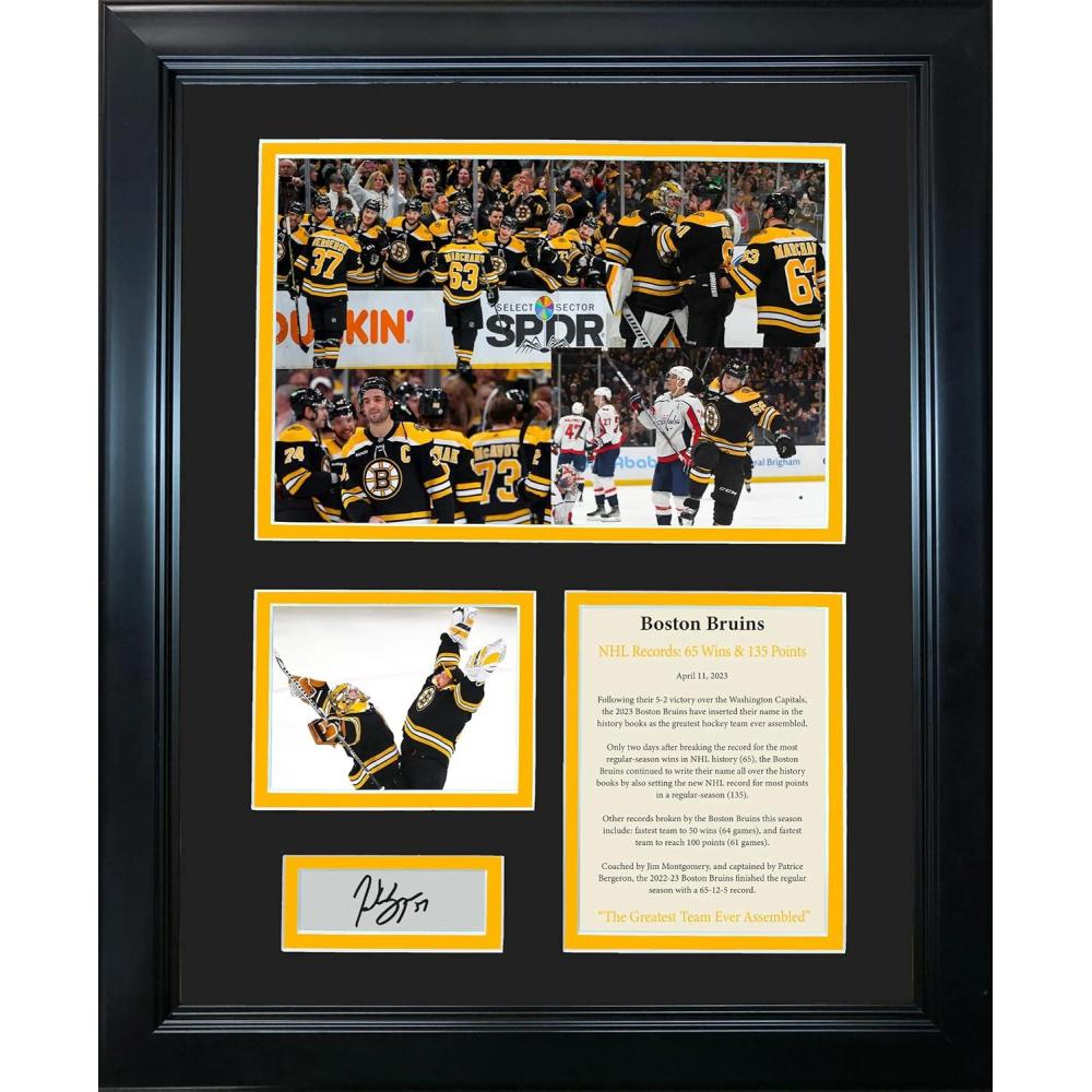 Framed 2022-23 Boston Bruins The Greatest Team Ever Assembled Record Wins & Points - Patrice Bergeron Facsimile Laser Engraved Signature Auto 11"x14"Hockey Photo Sig Collage