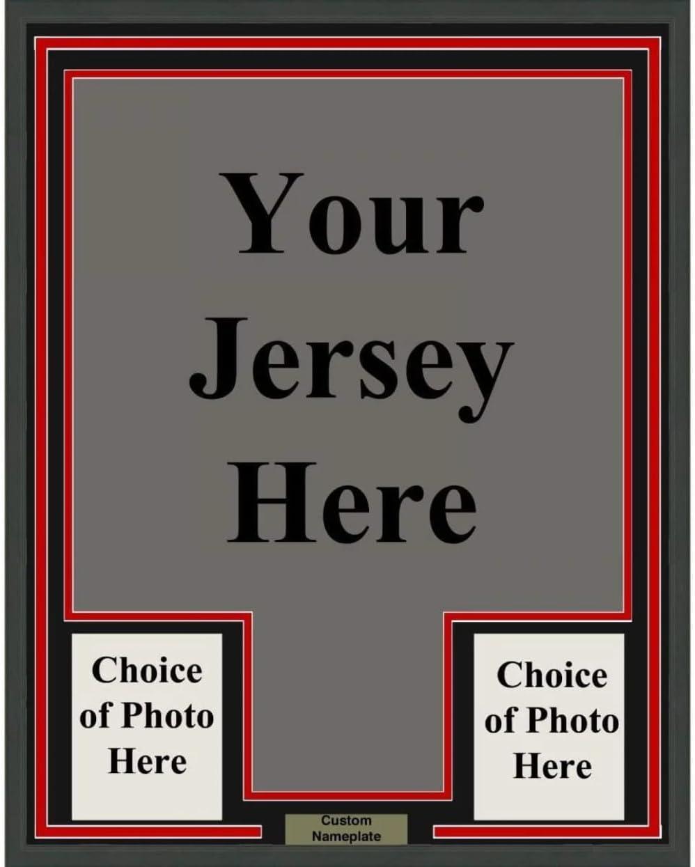 This listing is for a YOUR JERSEY professionally framed and matted with two 5×7 photos, measures 35″x39″ and is ready to be hung in your man cave! We will need you to send us the jersey that you want to be framed. You can select the colors of the matting and background as well as the two photos and what you would like on the nameplate. The COA (if applicable) card will be mounted on the back of the frame