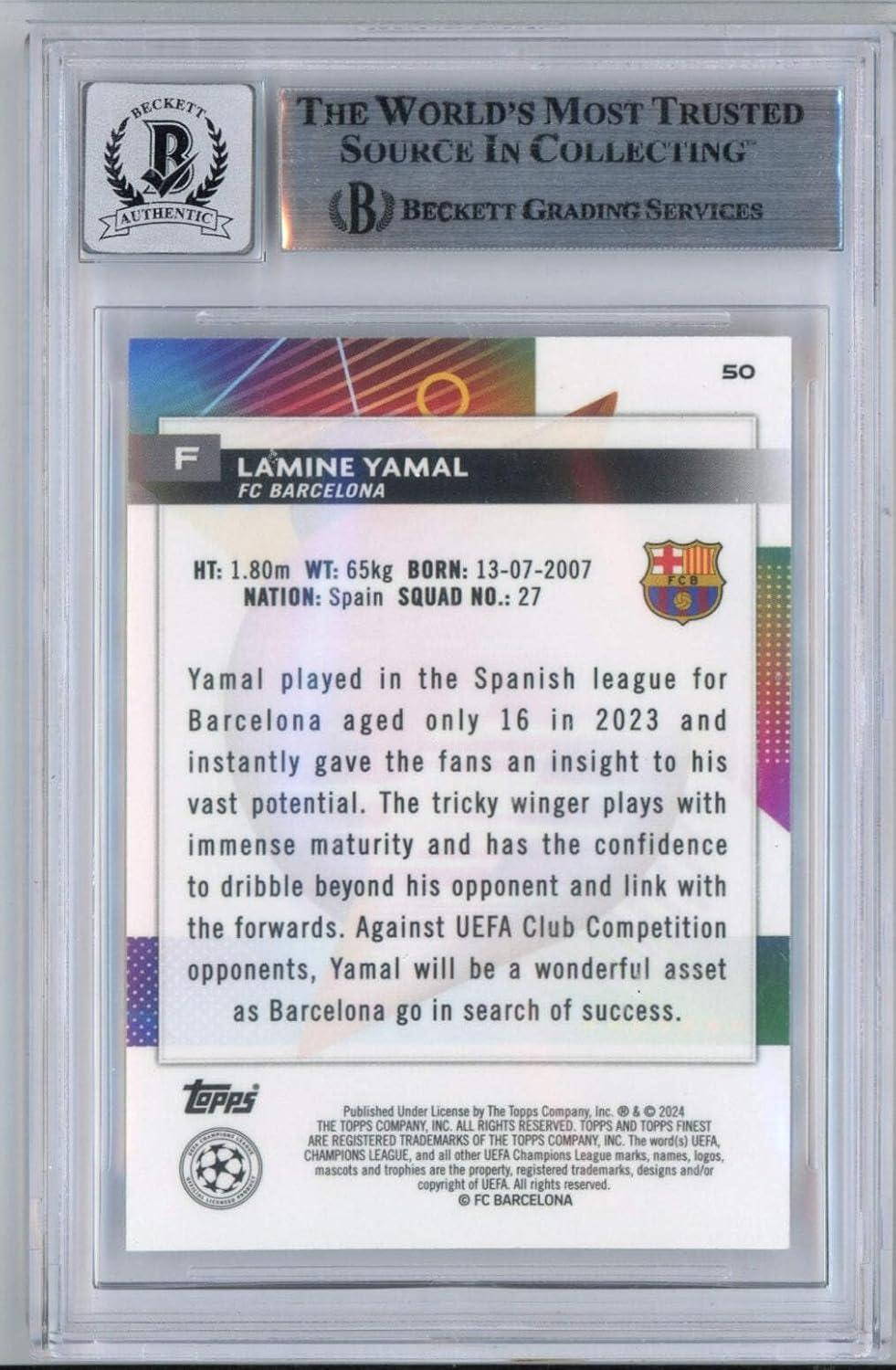 Graded 2023-24 Topps Finest UCC Lamine Yamal #50 Signed Rookie RC Soccer Card Beckett BAS BGS Auto 10