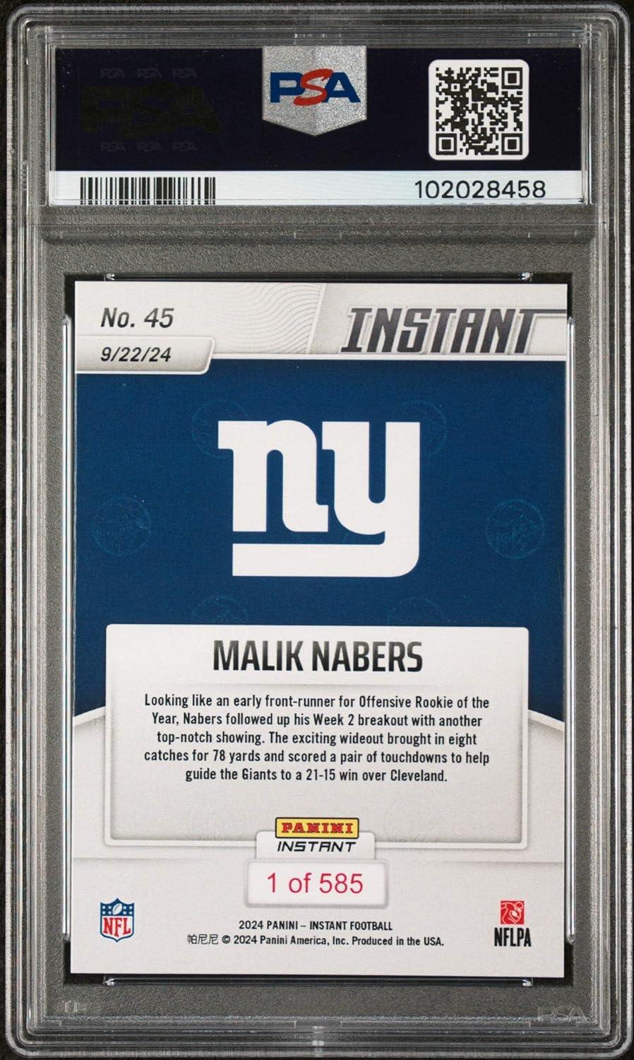 Graded 2024 Panini Instant NFL Malik Nabers #45 Rookie RC Football Card PSA 10 Gem Mint