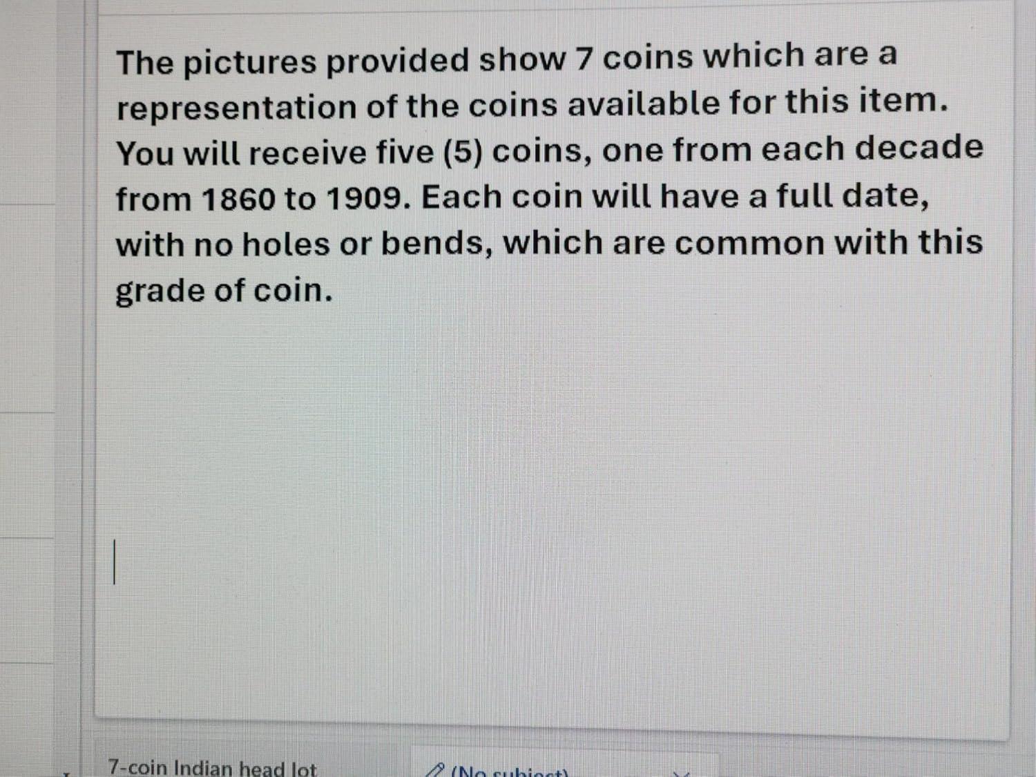 All of the coins are good dates. Any Indian head in the 1860s 1870s 1880s and 1890s are good dates. You will get a total of 5 coins — one dated from 1860 to 1869; one dated 1870 to 1879; one dated 1880 to 1889; one dated 1890 to 1899; and one dated 1900 to 1909.