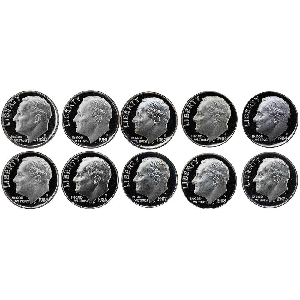 imageHall of Fame Sports Memorabilia  1980 S 1981 1982 1983 1984 1985 1986 1987 1988 1989 Roosevelt Dimes  10 Coins  Complete Decade  All S Mint Mark  Collection US Mint Gem Proof